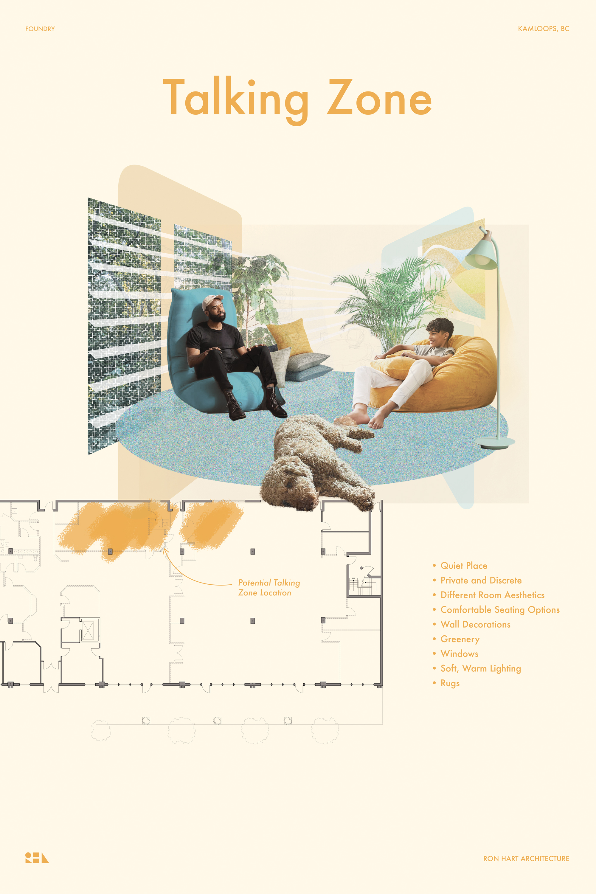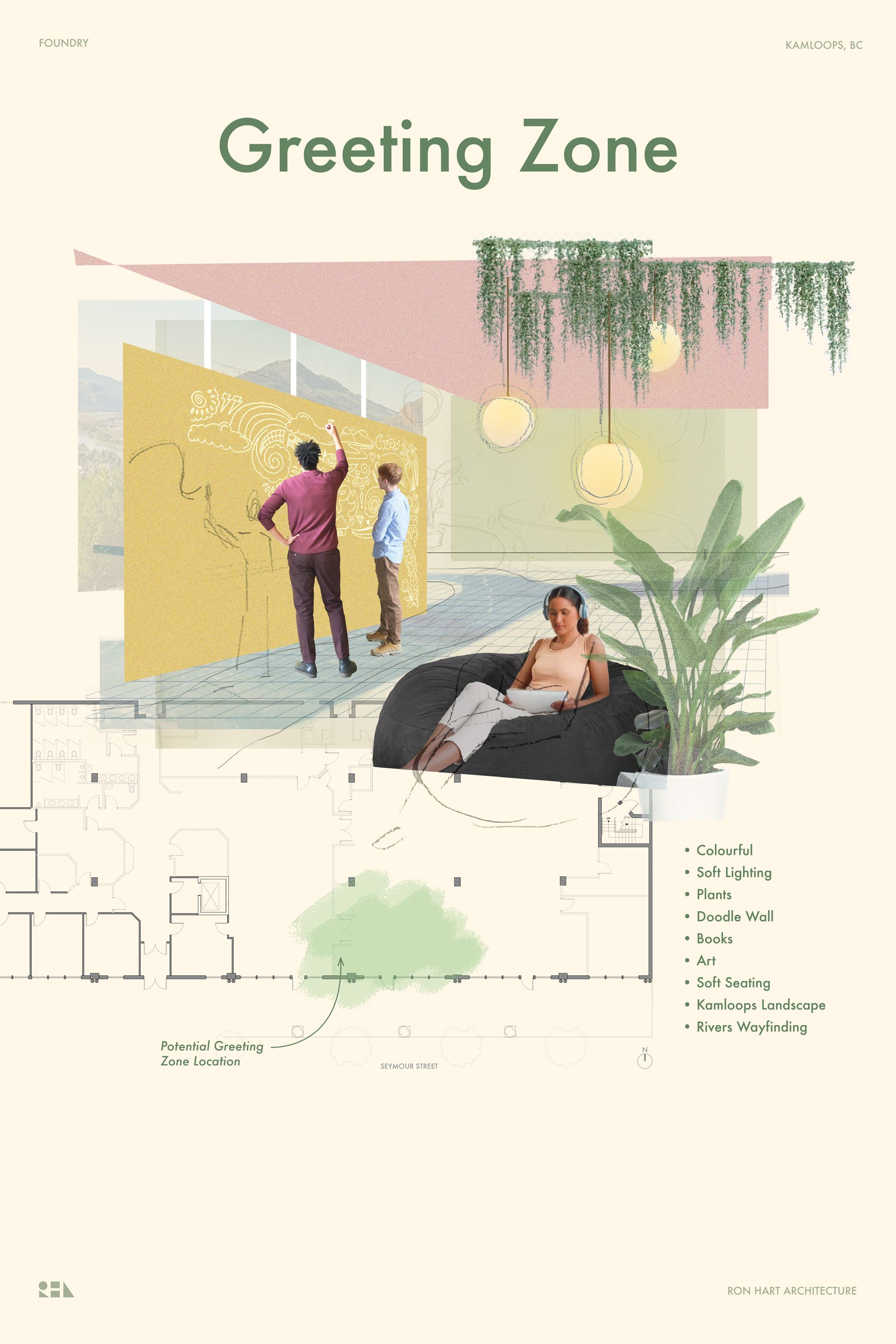 With a focus on being welcoming, calming, fun, and rooted in the community, the Kamloops Foundry features a playful colour pallette inspired the local landscape and wildlife, rich textures, and interconnected spaces to support the needs of the Foundry.