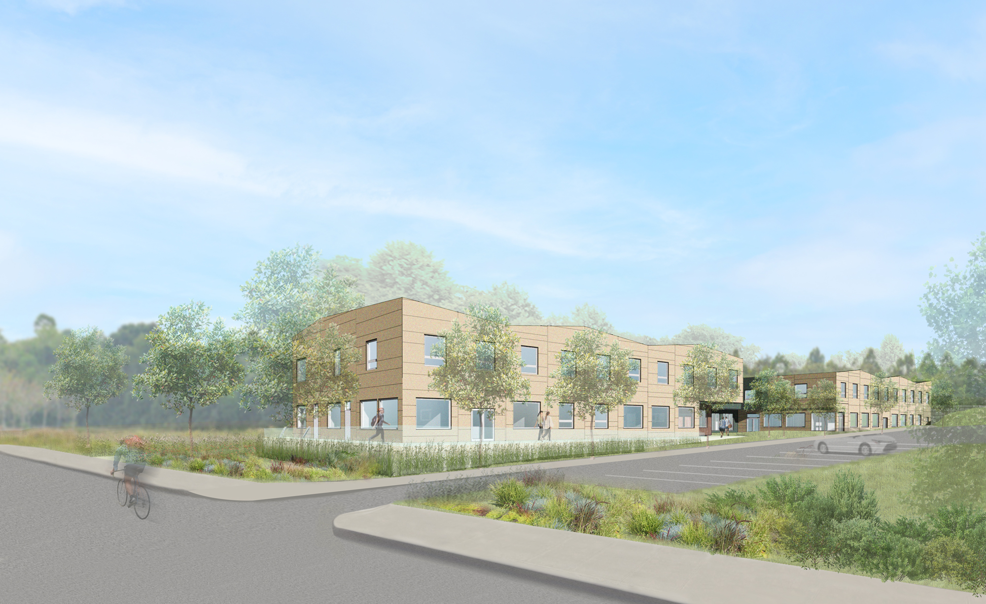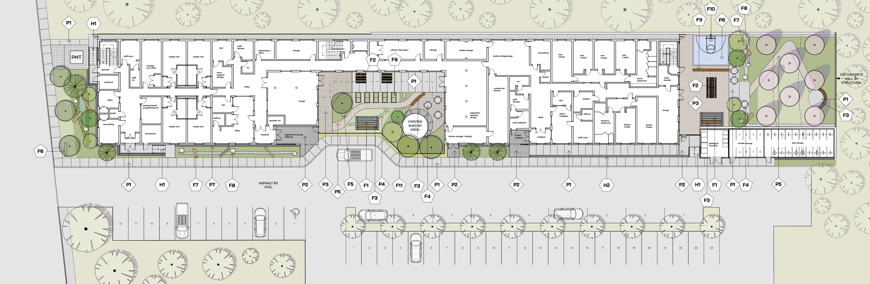 This project will provide permanent complex care and supportive housing, as well as a 20 bed shelter for individuals at risk of homelessness in Powell River, BC. This project includes a commercial kitchen, amenity spaces, and an on-site clinic. The site is located within the Tla’amin Nation—RHA has been in conversation with the nation to represent some architectural vernacular in the building through materiality and abstracted forms of traditional long houses. Outdoor spaces have been thoughtfully designed by Land Affairs.